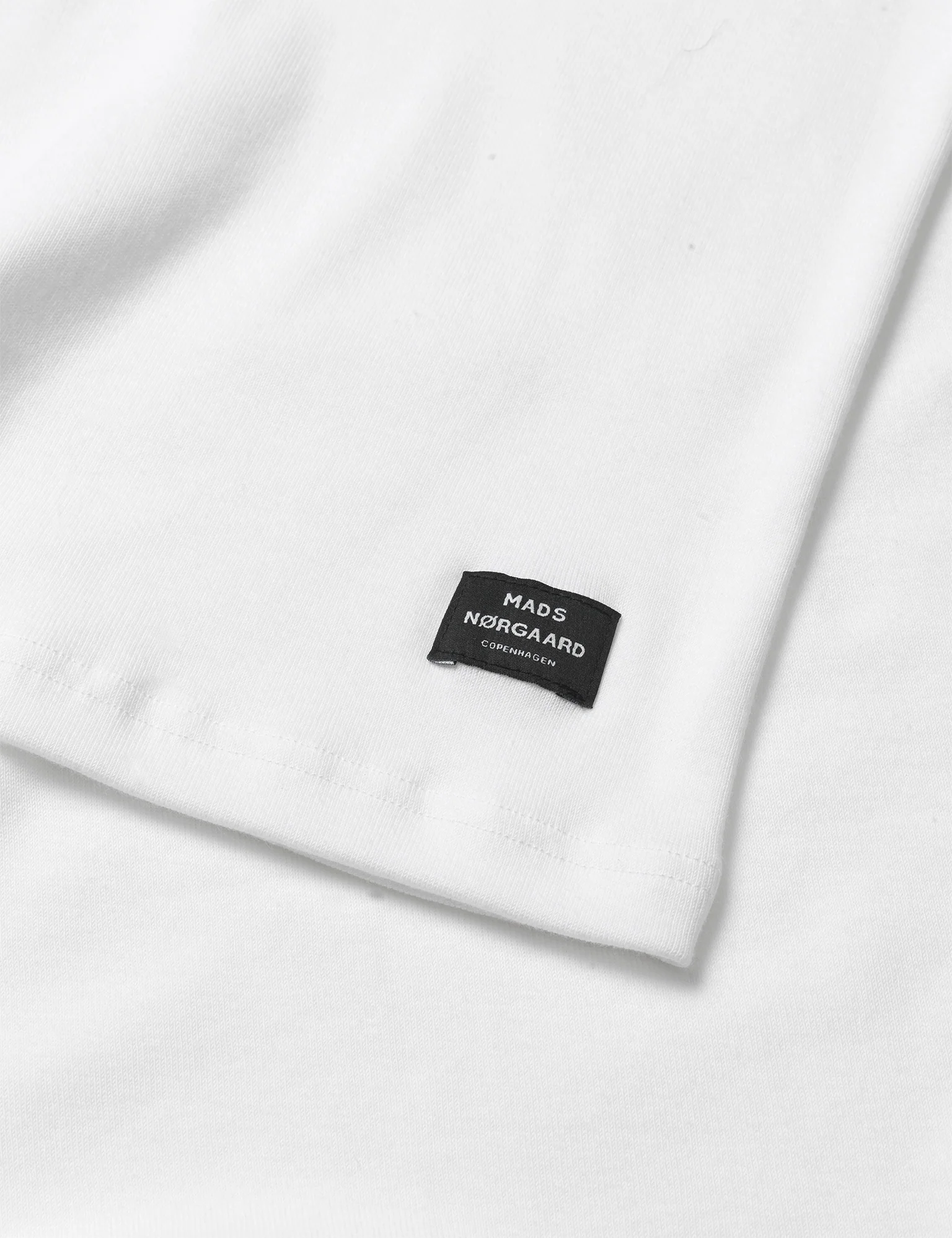 This white T-shirt features the Mads NĂžrgaard logo on the side.
